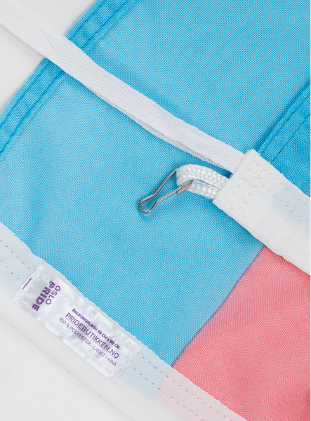 Transflagg for balkongstang i god kvalitet. Du kan enkelt bytte ut flagget på din balkongstang ved å bruke flaggets hemper og kroker. Dersom du ikke har en eksisterende stang kan du kjøpe et komplett kit.